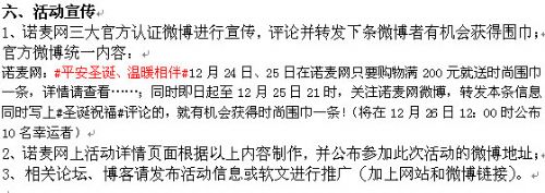 活动主题是关键所在,必须要用几个词语或者一句话把这次活动的内容表达出来,让用户觉得简单明了。比如说:我们网站这次选择活动主题就是《“平安圣诞、温暖相伴”—诺麦网购物满200元送“围脖”活动》。