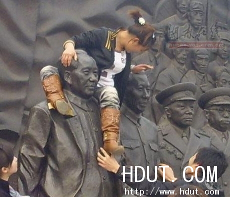 “太可耻了,居然骑在毛主席塑像头上照相!”19日,网友“沉默的麻雀”在某论坛上发出题为“一个可耻的中国人”的帖子,以图片的形式爆料:2月14日,在长沙世界之窗,一名年轻女游客在同伴的帮助下爬上毛主席雕像,并骑在雕像的肩膀上拍照。看了图中“可耻”的一幕,200余名网友跟帖表示愤慨,有人甚至提出要“人肉搜索”出这个“脑残”。从论坛发布的两张图片看,这名骑上雕像的女孩年龄在20岁左右,与她同行的一名男孩帮助她爬上雕塑,另外两名女孩则拿出手机为她拍照。