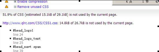 说明:在网站的CSS文件中可能会存在一些用不到的代码,这项工作应该在网站的发布之前对CSS,JS文件进行检查,删除没有用到的代码,该列表中详细的列出了没有用到的CSS代码。