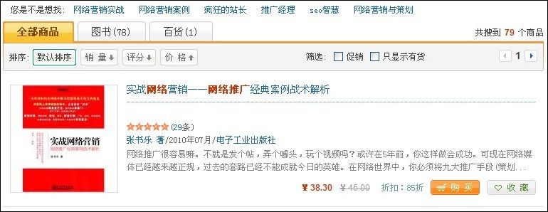长尾关键词选择挖掘非常重要,但也需要网站相应的配合,因为长尾关键字选择过多可能使用户最终不做选择。吴锋刚进入网络推广行业,想在当当网买一些关于网络推广的书,搜索”网络推广”,返回79本图书。几乎可以肯定,如果不是网络推广方面朋友曾经给我推荐一本书,我不太可能去研究这79本书哪本更合适。