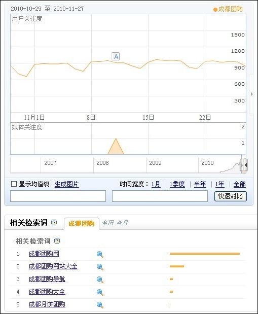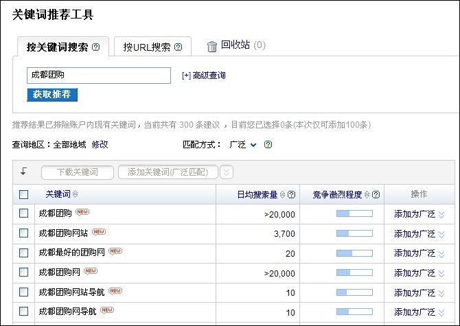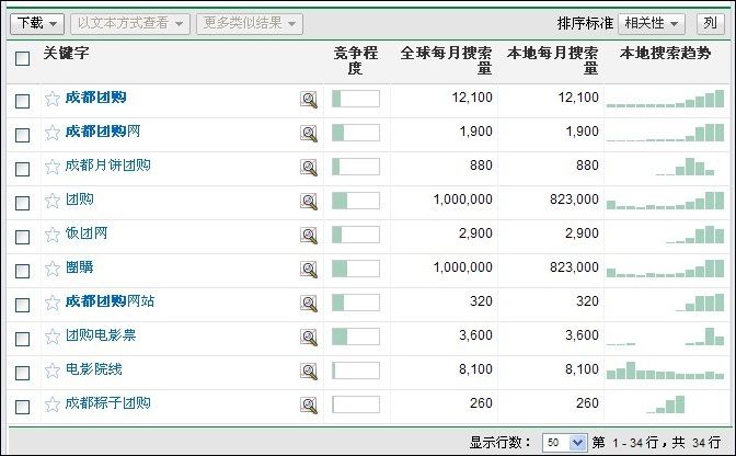 输入“成都团购”,Google关键词工具自动生成与之相关的成都团购网、成都月饼团购等数可以考虑的关键词,并且列出了广告商竞争程度及搜索量。权重搜索量就代表着用户关注程度和市场需求。 Google Adwords关键词工具链接:https://adwords.google.com/select/KeywordToolExternal