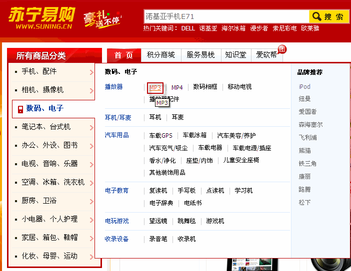 苏宁易购的产品导航与明星示范非常相似,并由于它是唯一一家将MP3和MP4分开的网站,所以首页导航给我的感觉非常好。
