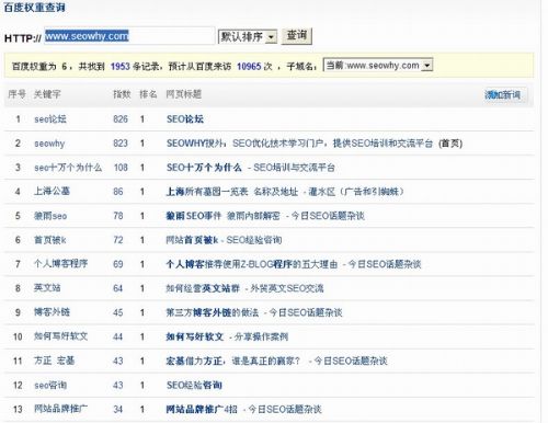 从上面我们可以很快地查询到对方网站目前的一些关键词排名情况,如果对方有几个关键词其百度指数在50以上,而且在百度首页有排名,说明该网站的SEO优化的质量可行。