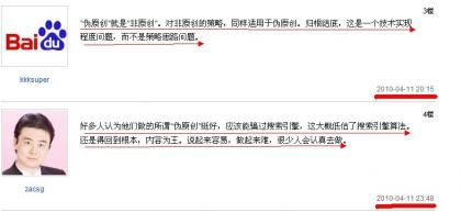 2010年4月百度俱乐部管理员明确表态,“伪原创”就是“非原创”