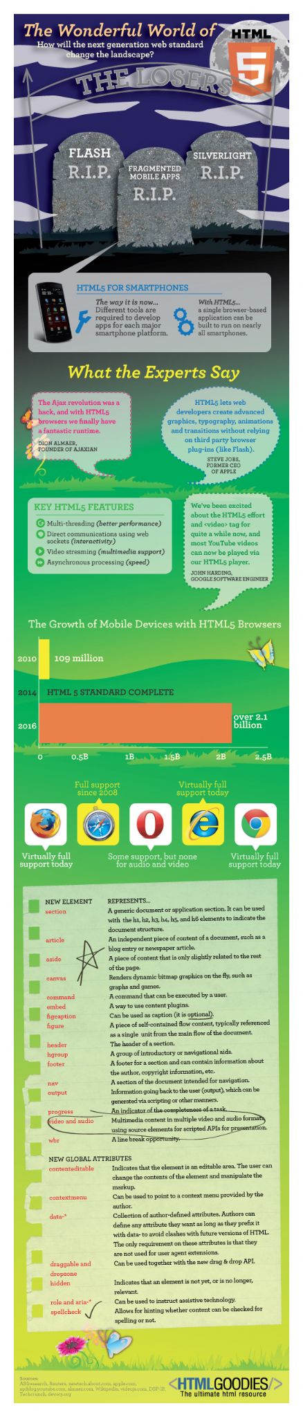 该信息图表显示,预计2016年将有超过21亿部移动设备使用HTML5浏览器,该数据是2010年1.09亿的20倍之多。与此同时,还介绍了HTML5的新功能和特性。
