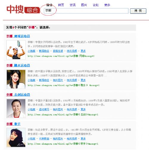举个例子:当你在搜索框中输入“李娜”两个字时,一般想搜的可能是网球运动员李娜、游泳运动员李娜、击剑运动员李娜和歌手李娜,因为只有这几个结果才是用户比较关注的,第三代搜索居然可以考虑到这些可能性,在搜索结果中把这些信息整理出来,如图: