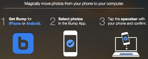 2. 利用特定的交互方式,像Bump连接Web端(图8),通过手机的重力感应感知到「bump」,然后将地理位置与碰撞时间等信息上传到服务器,服务器根据最接近的时间点和地点判断出手机或者电脑的IP地址,为它们建立通信配对。虽然也可用来进行用户登录,但安全性较差,真要采用这种方式,可就要改进一下相关的流程。