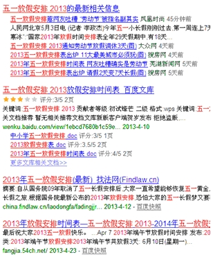 我们就从“五一放假安排2013”这个词作为突破口,我们可以看到排名第一位的是百度网页应用,这个我们就不提了,剩下的是新闻、百度文库以及高权重的个人网站。对于这一块,想百度自己的产品还有新闻我们站长就不要打小算盘了,更有一些站长为了节日单独做了几个网站,我觉得可以尝试,但是耗费的经历也颇大.